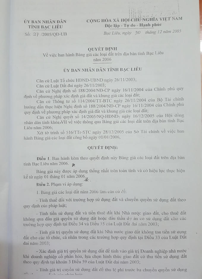 Theo đó, cơ sở để áp giá đền bù cho các hộ dân đó là căn cứ theo Quyết định số 02/QĐ-UB (sau đây viết tắt là Quyết định số 02) ngày 12/01/2005 của UBND tỉnh Bạc Liêu về việc ban hành Bảng giá các loại đất trên địa bàn tỉnh. Theo Bảng giá đất này, đất ở (nằm trong dự án) của các hộ dân trên thuộc vị trí 1 có giá 800.000đ/m2. Thế nhưng, UBND tỉnh và UBND huyện Phước Long lại áp giá chỉ 80.000đ/m2 (thấp hơn 10 lần giá đất công bố). (?!)