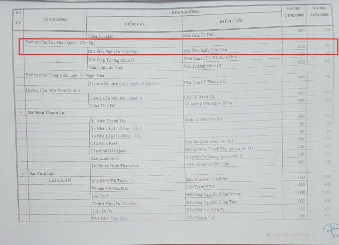 Trong khi đó như đã đề cập, theo Quyết định số 27 về việc ban hành Bảng giá các loại đất do UBND tỉnh Bạc Liêu công bố, áp dụng năm 2006 thể hiện, tại Phụ lục 3, trang 31 nêu rất rõ, đoạn đường từ điểm đầu nhà ông Nguyễn Văn Phải đến điểm cuối nhà ông Kiều Văn Dân (tức ông Kiều Thành Văn) có giá đất 800.000đ/m2 (ngay cả Quyết định số 02 về giá đất năm 2005 cũng có tên ông Văn là 800.000đ/m2).