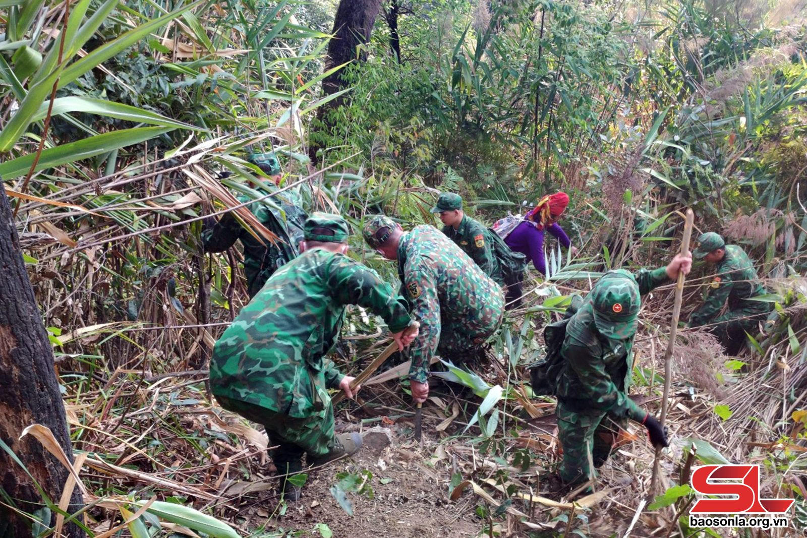 Hình ảnh minh họa - Cán bộ, chiến sỹ phát đường băng cản lửa tại bản Liềng, xã Mường Lèo. Ảnh Báo Sơn La