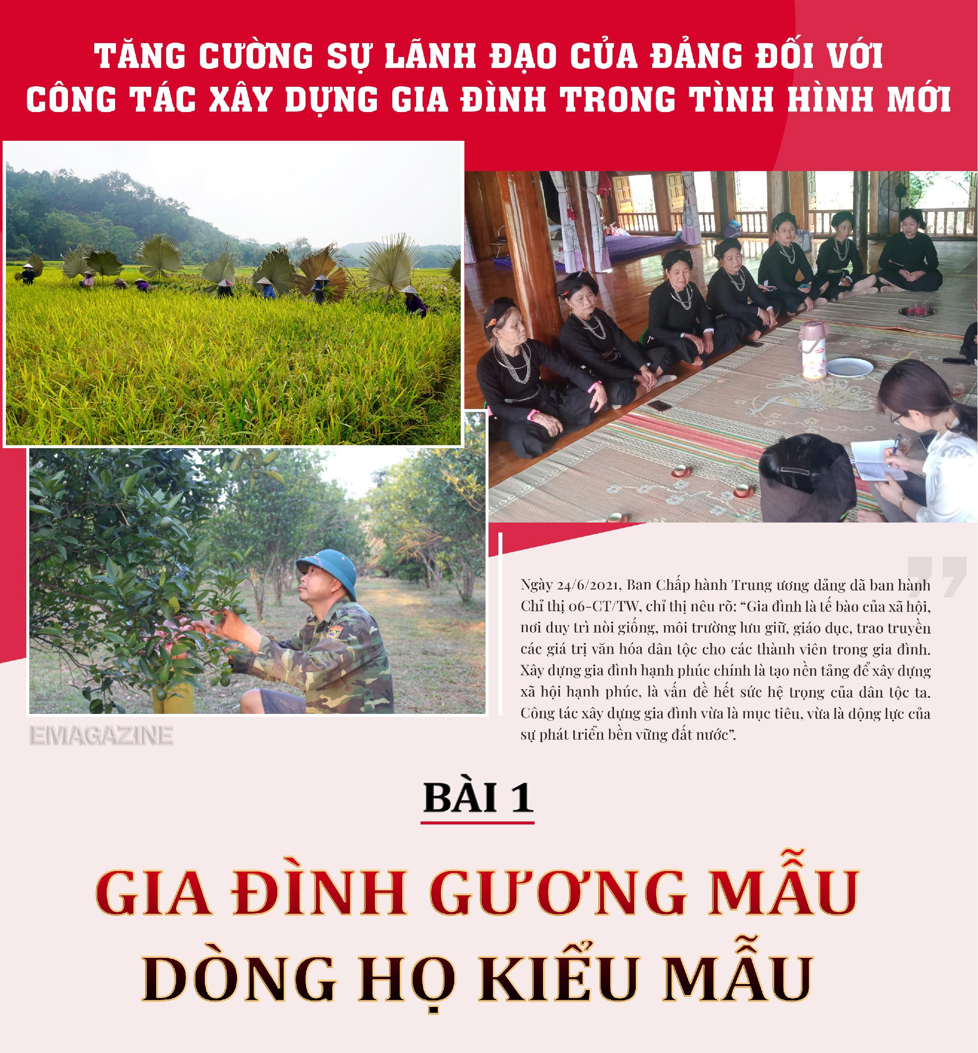 Ngày 24/6/2021, Ban Chấp hành Trung ương đảng đã ban hành Chỉ thị 06-CT/TW, chỉ thị nêu rõ: “Gia đình là tế bào của xã hội, nơi duy trì nòi giống, môi trường lưu giữ, giáo dục, trao truyền các giá trị văn hóa dân tộc cho các thành viên trong gia đình. Xây dựng gia đình hạnh phúc chính là tạo nền tảng để xây dựng xã hội hạnh phúc, là vấn đề hết sức hệ trọng của dân tộc ta. Công tác xây dựng gia đình vừa là mục tiêu, vừa là động lực của sự phát triển bền vững đất nước”.