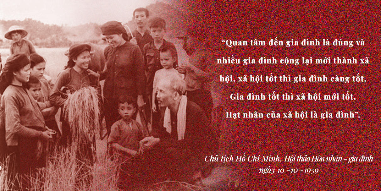 Trong buổi Hội thảo hôn nhân - gia đình ngày 10/10/1959, Bác Hồ dạy: “Quan tâm đến gia đình là đúng và nhiều gia đình cộng lại mới thành xã hội, xã hội tốt thì gia đình càng tốt. Gia đình tốt thì xã hội mới tốt. Hạt nhân của xã hội là gia đình”.
