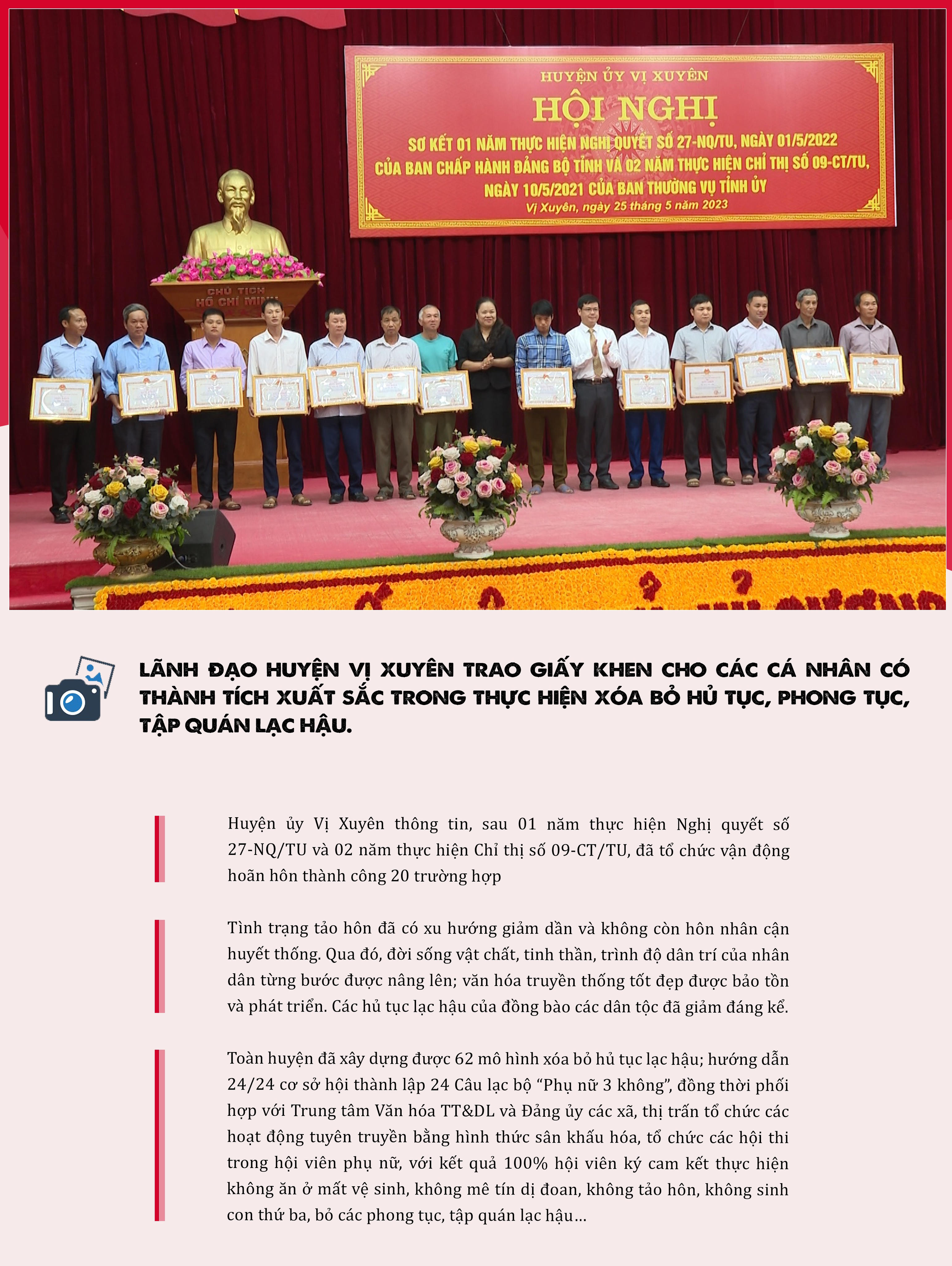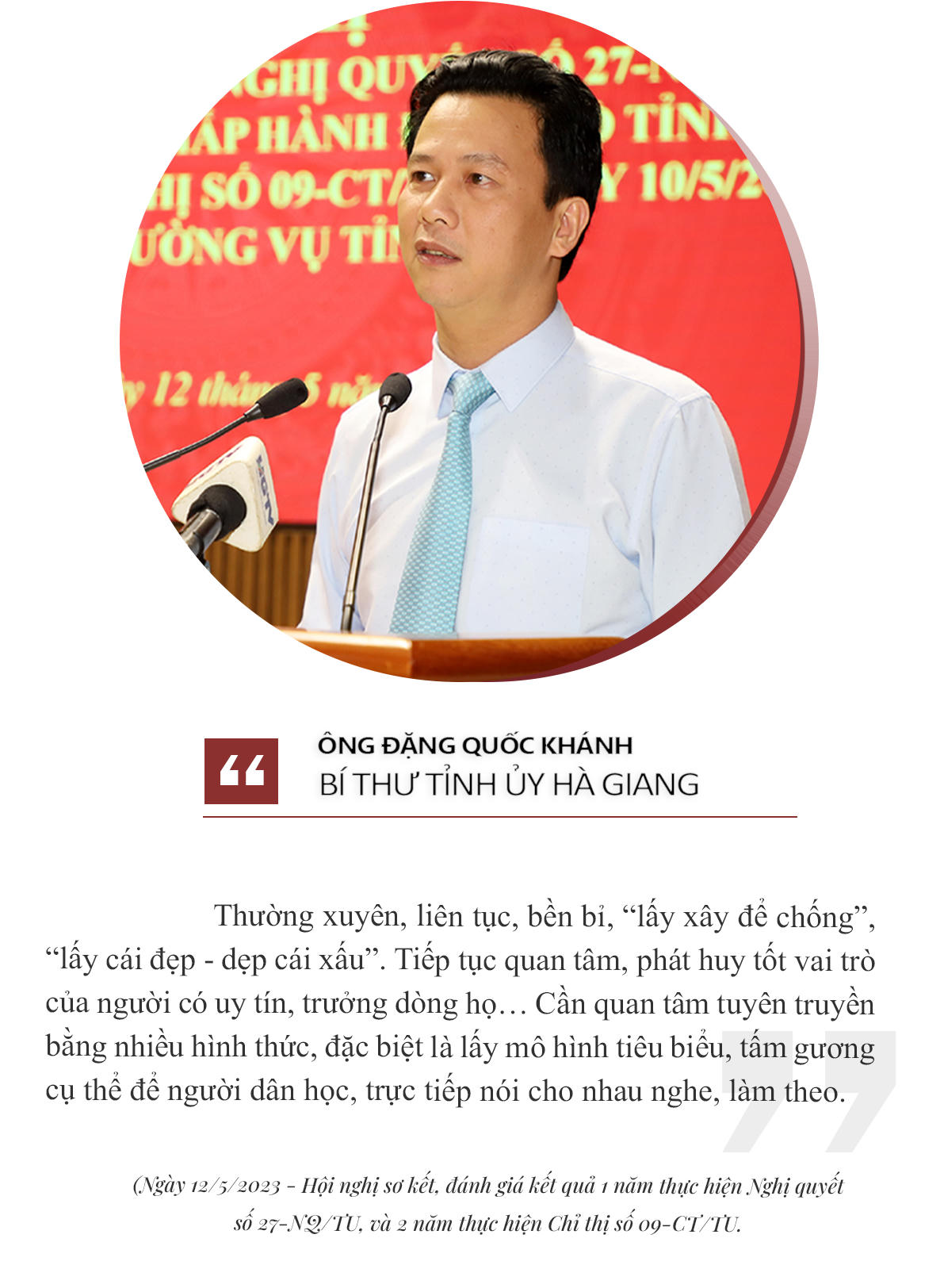 Tại Hội nghị, ông Đặng Quốc Khánh, Ủy viên T.Ư Đảng, Bí thư Tỉnh ủy, Trưởng đoàn Đại biểu Quốc hội khóa XV tỉnh Hà Giang (nay là Bộ trưởng Bộ Tài nguyên và Môi trường) cho biết: “Qua 1 năm thực hiện Nghị quyết số 27 và 2 năm thực hiện Chỉ thị số 09, tỉnh Hà Giang đã đạt được những kết quả quan trọng. Toàn tỉnh có 9.910 cặp đôi đăng ký kết hôn, tổ chức cưới theo nếp sống văn minh; vận động, can thiệp hoãn 330 cặp chưa đủ điều kiện kết hôn. Các hủ tục trong đám tang dần được loại bỏ, không còn hiện tượng mời thầy cúng yểm bùa, trừ tà, lăn đường, khóc mướn… bài cúng của thầy mo, thầy tạo được rút ngắn; hạn chế giết mổ nhiều gia súc, rượu chè linh đình nhiều ngày; thời gian tổ chức tang lễ không quá 48 giờ, thi hài người chết được chôn cất chu đáo.