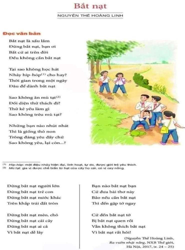 Như ở bài thơ Bắt nạt (trích trong tập thơ Ra vườn nhặt nắng) của tác giả Nguyễn Thế Hoàng Linh trong sách Ngữ văn lớp 6, tập 1, bộ Kết nối tri thức với cuộc sống (NXB Giáo dục Việt Nam). Nội dung bài thơ xuyên suốt nói về những mặt tiêu cực, không tốt của việc đi bắt nạt người khác và khuyên các em học sinh (HS) không nên bắt nạt các bạn yếu thế hơn mình.