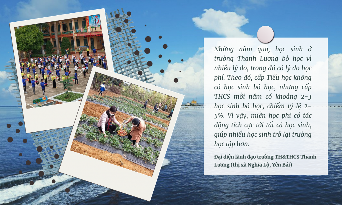 Nói về tác động tích cực của chính sách miễn học phí với học sinh vùng khó khăn, Thượng úy Sa Quang Hiệp (Công an xã Thanh Lương, thị xã Nghĩa Lộ, Yên Bái) cho rằng, miễn học phí giúp học sinh đi học đầy đủ, đều đặn hơn, đặc biệt là học sinh ở vùng núi. Hơn nữa, chất lượng giáo dục cũng được nâng cao, giáo viên có nhiều thời gian hơn để chăm chút cho bài dạy hơn.