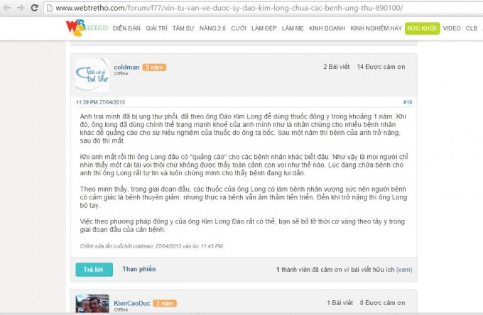 Không chỉ riêng anh Huy, trên những diễn đàn trao đổi kinh nghiệm chữa bệnh ung thư, có rất nhiều lời bình luận về hiệu quả chữa bệnh của thầy lang.