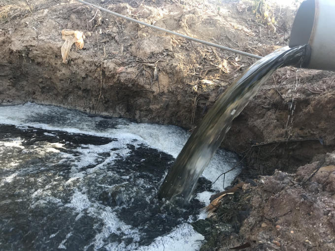 Đặc biệt khi đến gần ao chưa mùi hôi thối dường như không thể chịu đựng nổi. Dòng nước thải ào ào đổ về xủi bọt, phía trên xác tôm nổi đông thành váng. Tại ao chứa cuối cùng có hai họng cống đang đổ loại nước thải đen kịt ra dòng khe Chùa.