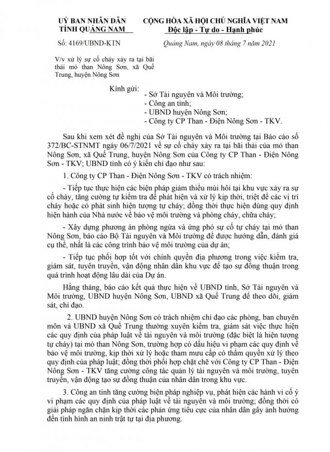 Trong đó, UBND tỉnh chỉ đạo Công ty CP Than - Điện Nông Sơn -TKV có trách nhiệm tiếp tục thực hiện các biện pháp giảm thiểu mùi hôi tại khu vực xảy ra sự cố cháy, tăng cường tự kiểm tra để phát hiện bvaf xử lý kịp thời, triệt để các vị trí cháy hoặc có phát sinh hiện tượng chay; đồng thời thực hiện đúng quy định hiện hành của Nhà nước về bảo vệ môi trường và phòng cháy chữa cháy.