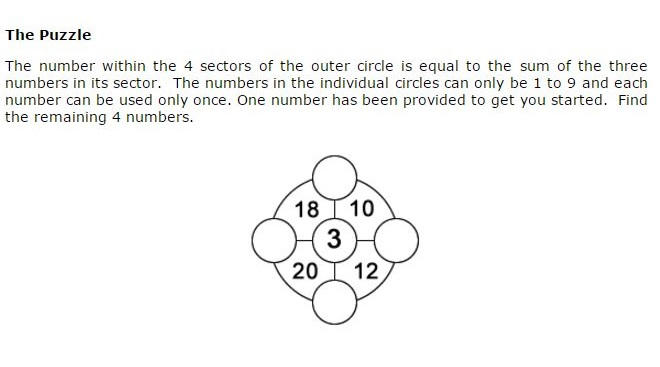 Hình tròn to được chia làm 4 phần, mỗi phần sẽ bằng tổng của 3 hình tròn nhỏ xung quanh nó. Điền vào các hình tròn nhỏ giá trị tương ứng sao cho các số chỉ từ 1 đến 9 và không lặp lại, biết hình tròn nhỏ ở giữa bằng 3. Tìm giá trị 4 hình tròn nhỏ còn lại.