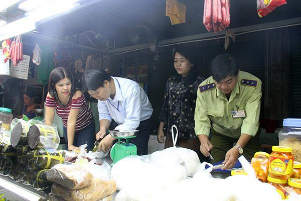 Đoàn kiểm tra liên ngành của Ban chỉ đạo 389/ĐP tỉnh Đồng Nai phối hợp với địa phương kiểm tra các gian hàng thực phẩm tại chợ Long Thọ (huyện Nhơn Trạch).