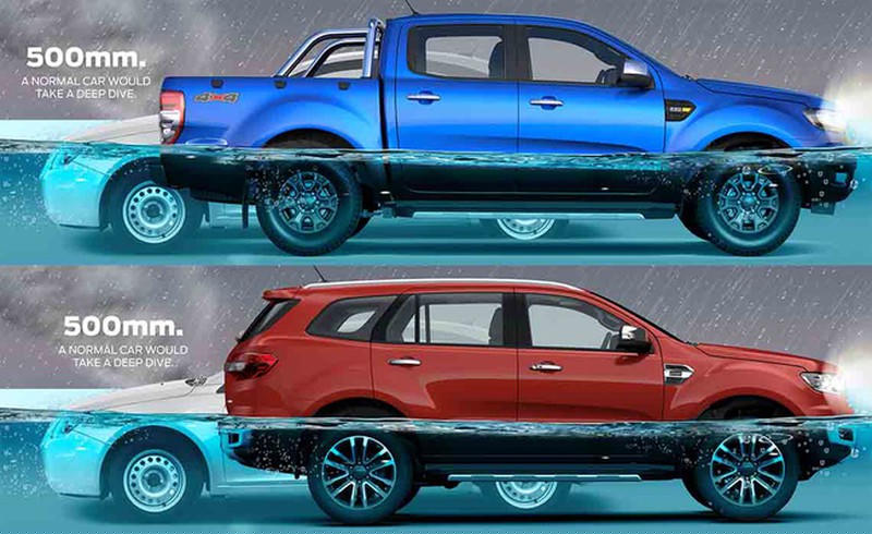 Các bánh xe của Ranger có thể được tận dụng để kiểm tra mức an toàn của mực nước ngập. Độ sâu của nước không được vượt qua ốp chắn bùn ở bánh xe trước đối với các phiên bản Ranger 4×2 được tăng chiều cao và phiên bản 4×4. Còn với phiên bản Ranger 4×2 tiêu chuẩn, mực nước không được ngập quá toàn bộ lốp xe.