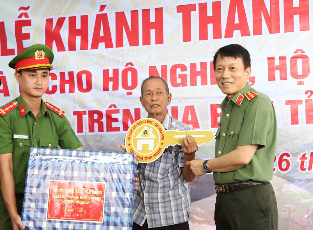 Phát biểu tại buổi lễ, Thượng tướng Lương Tam Quang - Thứ trưởng Bộ Công an cho biết, trên cơ sở thống nhất chủ trương với tỉnh Hà Tĩnh và từ sự giúp đỡ, ủng hộ của các đơn vị tài trợ, nhà hảo tâm với tinh thần “Trao yêu thương để nhận về hạnh phúc", Bộ Công an đã quyết liệt chỉ đạo các đơn vị chức năng thiết kế mẫu nhà, cách thức, phương pháp thực hiện để Công an tỉnh Hà Tĩnh chung tay cùng bà con nhân dân xây dựng nhà ở, góp phần ổn định cuộc sống người dân tại các địa bàn khó khăn.