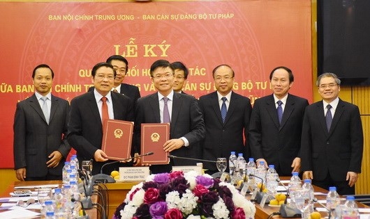 | Trưởng Ban Nội chính Trung ương Phan Đình Trạc và Bộ trưởng Bộ Tư pháp Lê Thành Long ký kết Quy chế phối hợp công tác giữa Ban Nội chính Trung ương và Ban Cán sự Đảng Bộ Tư pháp. |