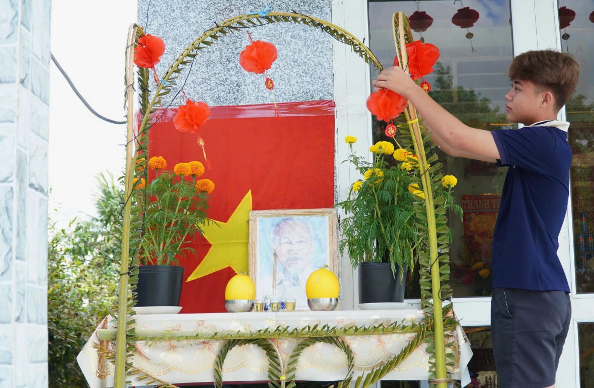 Trên bàn thờ được bày biện trang trọng: di ảnh Bác Hồ, quốc kỳ, lư hương nghi ngút khói, hoa tươi, mâm ngũ quả. Mỗi khi trong nhà có bánh trái, trà rượu, con cháu đều thành kính dâng lên, như một lời tri ân lặng lẽ nhưng sâu sắc gửi đến vị lãnh tụ kính yêu của dân tộc.