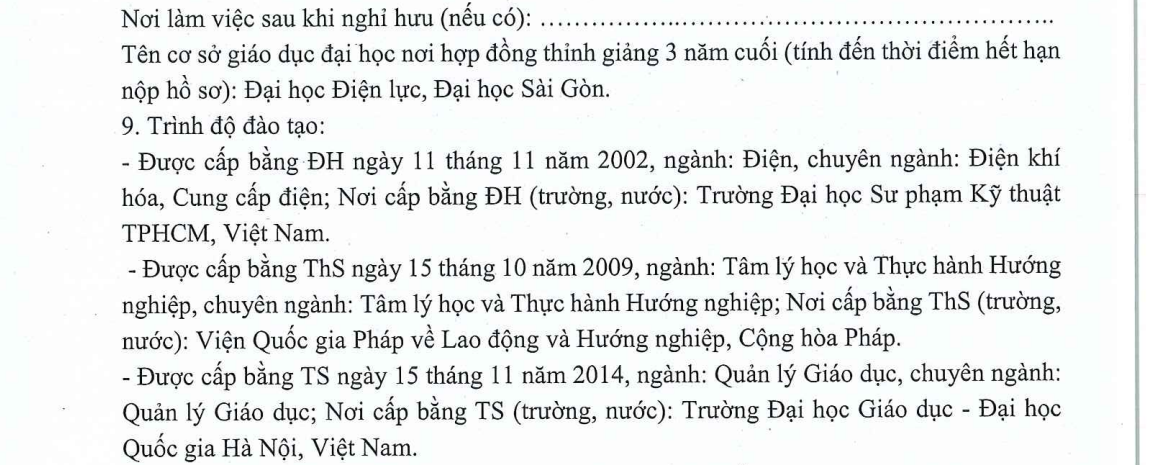 Như vậy, trong bản đăng ký này ông Hưng xin được phong Phó Giáo sư chuyên ngành Giáo dục, nhưng lại kê khai thời gian giảng dạy chuyên ngành Điện. Việc này được phản ánh là không phù hợp với quy định.