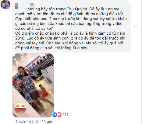 Một tài khoản khác lên tiếng: "Mọi người hãy tôn trọng Thu Quỳnh. Cô ấy là một single mom mạnh mẽ, vượt lên tất cả chỉ để dành tất cả những điều tốt đẹp nhất cho con. Có 2 điểm để khẳng định chắc chắn người trong clip không phải Thu Quỳnh. Đó là hình xăm có từ năm 2015 - 2016 khi cô ấy vừa sinh con và mái tóc dài. Thu Quỳnh chỉ thay đổi phong cách với tóc ngắn để vào vai My sói. Nhưng sau vai diễn thành công đó, cô ấy quá nổi tiếng chẳng cần phải "đóng" hay "cặp" với người đàn ông trong clip".