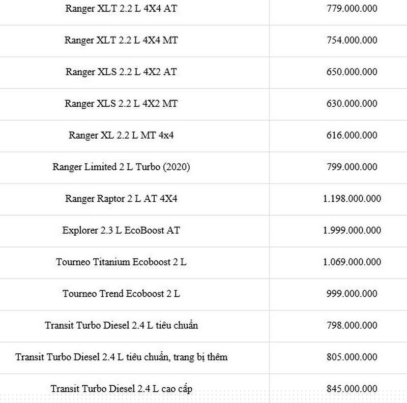 Dưới đây là chi tiết bảng giá xe Ford tháng 1-2021: