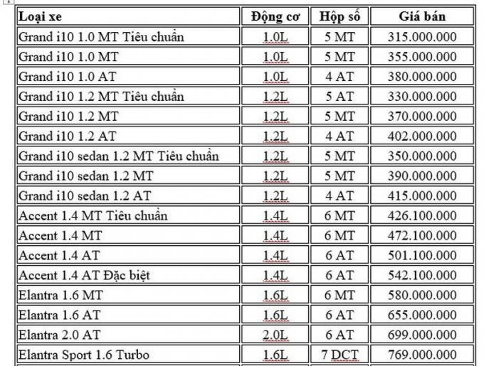 Mẫu xe rẻ nhất là Grand i10 với giá 315 triệu đồng. Hiện nay tại thị trường Việt Nam, Grand i10 bán ra với 9 phiên bản bao gồm cả hatback và sedan. Mức giá bán ra dao động từ 315 - 402 triệu đồng.