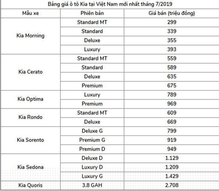 Bảng giá xe Kia mới nhất tháng 7/2019 tại thị trường Việt Nam. Ảnh: Báo Giao thông