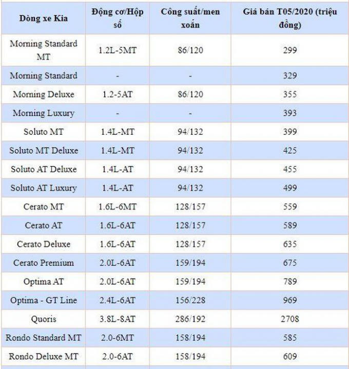 Giá xe KIA Morning tháng 5/2020, không có nhiều thay đổi khi toàn bộ phiên bản với 4 biến thể mới, bao gồm: Morning Deluxe giá 355 triệu, Morning Luxury giá 393 triệu, Morning Standard AT giá 329 triệu và Morning Standard MT giá 299 triệu đồng.