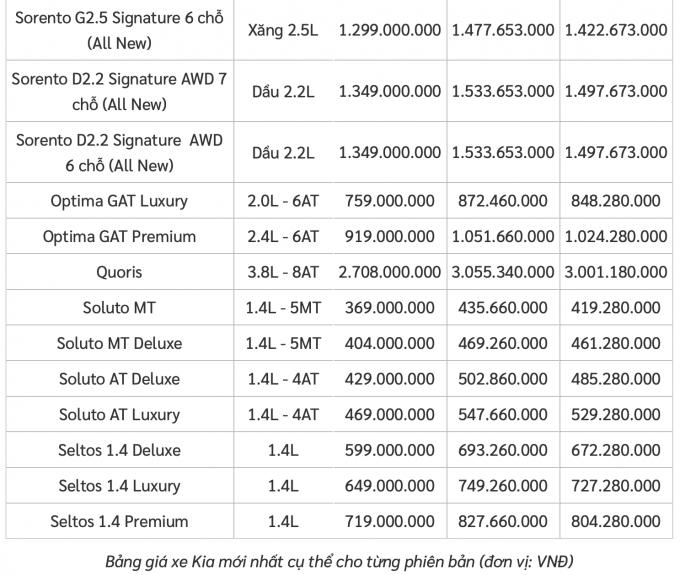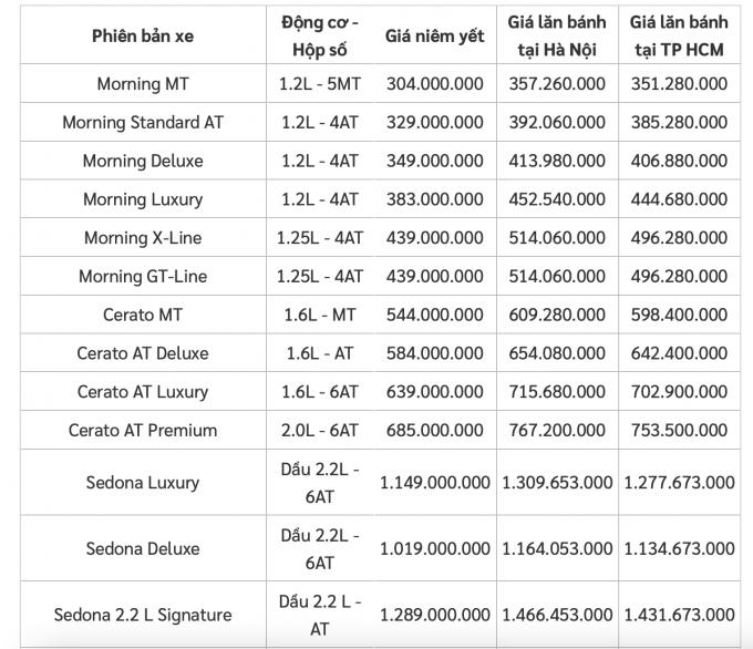 Với lợi thế xe lắp ráp trong nước, theo bảng giá xe ô tô, các mẫu xe Kia tại thị trường Việt Nam có mức giá rất hấp dẫn, mang tính cạnh tranh cao trước những đối thủ cùng phân khúc và phù hợp những gia đình có kinh tế giới hạn. Dưới đây là chi tiết bảng giá xe Kia cập nhật mới nhất tính tới tháng 5/2021: