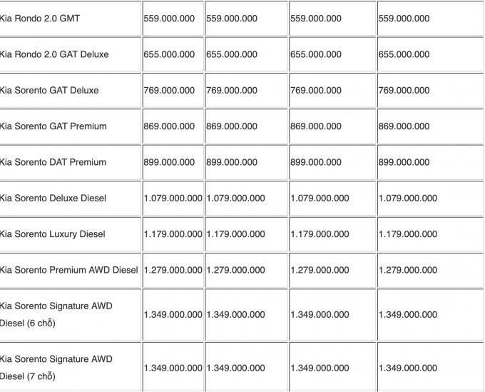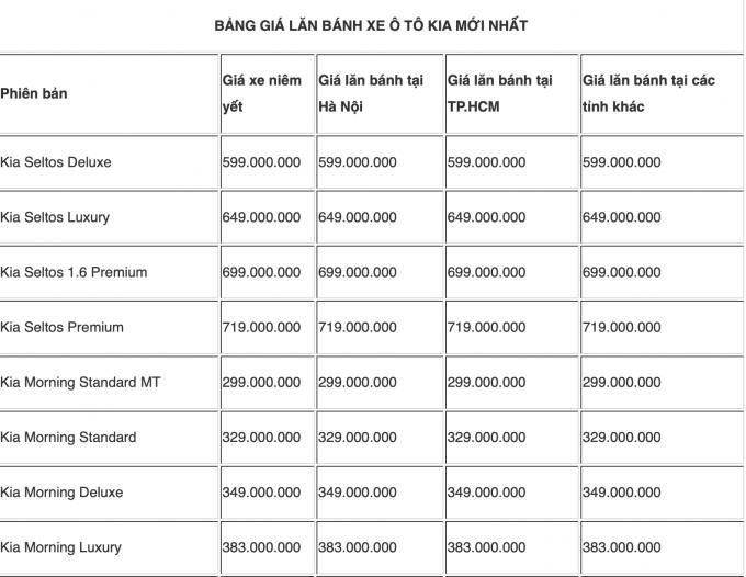 Bảng giá xe tham khảo.