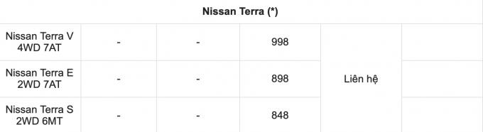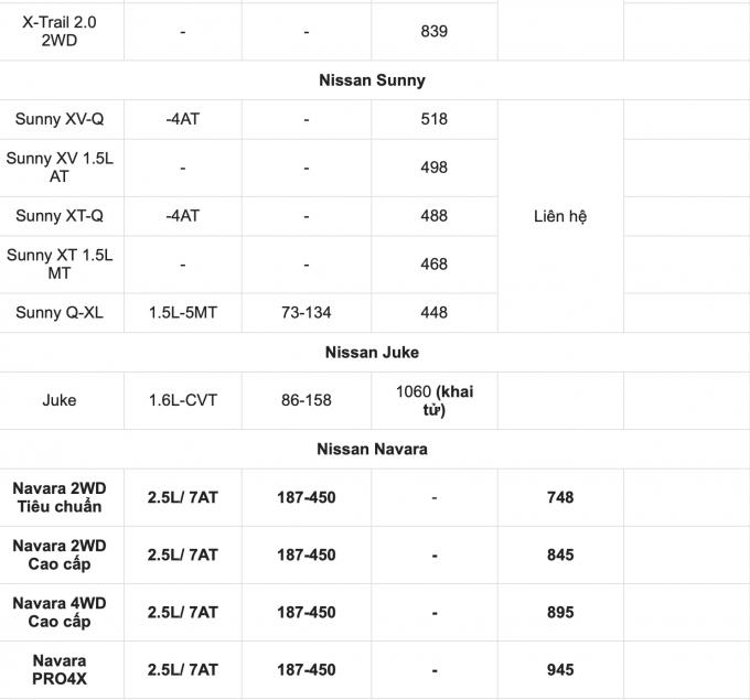 Bảng giá xe tham khảo