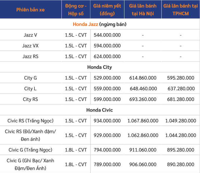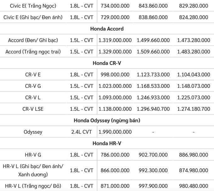Giá xe Ô tô Honda HRV, Honda City, Honda Civic, Honda Accord, Honda Jazz, Honda Brio và Honda CR-V.
