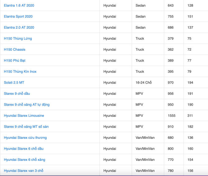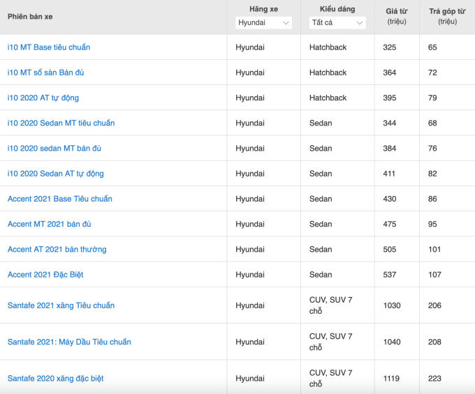 Bảng giá xe ô tô Hyundai tháng 1/2022 tham khảo.