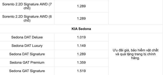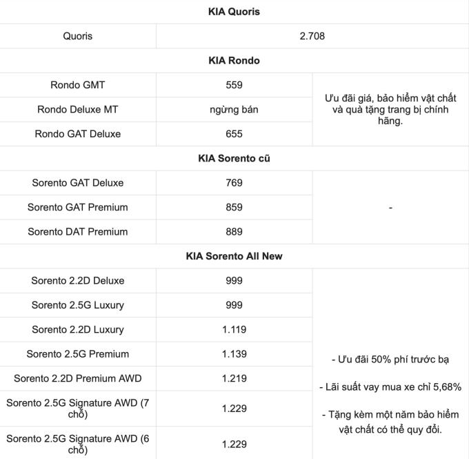 Bảng giá xe tham khảo: