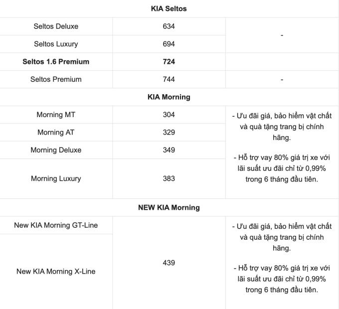 Giá xe ô tô Kia Morning tháng 1/2022 dành cho 2 phiên bản hoàn toàn mới là GT-Line và X-Line 2021 ở mức 439 triệu đồng. Trong khi, thế hệ cũ vẫn đang mở bán, bao gồm: Morning AT Deluxe: 349 triệu đồng; Morning Luxury: 383 triệu đồng; Morning Standard AT: 329 triệu đồng; Morning Standard MT: 304 triệu đồng...
