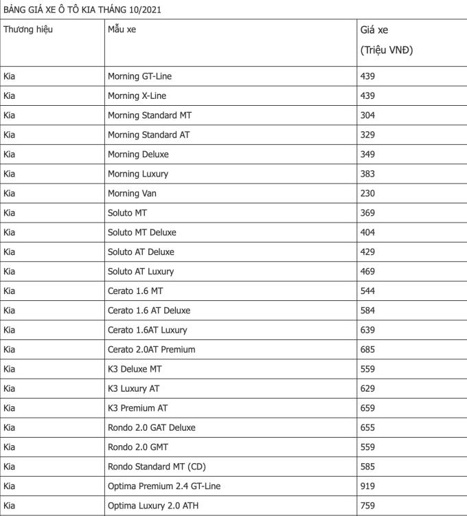 Cập nhật bảng giá xe hãng Kia tháng 10/2021, giá xe ô tô Kia Morning, Seltos, Soluto, Rio, Cerato, Optima, Rondo, Sorento, Sedona...