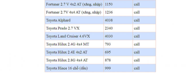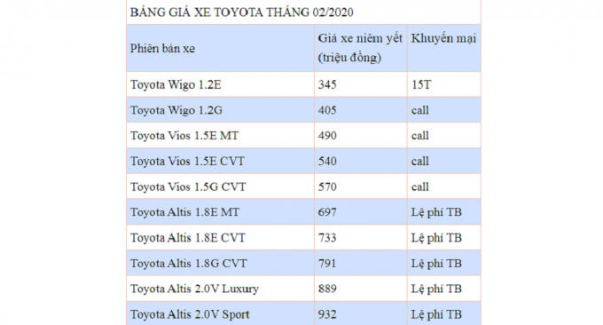 Bảng giá tham khảo ô tô Toyota tháng 2/2020:
