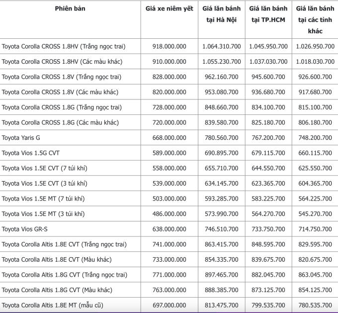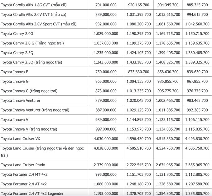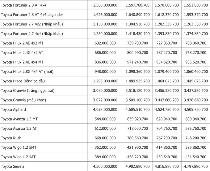 Cập nhật bảng giá các xe Toyota Vios, Corolla Altis, Innova, Avanza, Camry, Fortuner, Hilux, Land Cruiser, Rush...