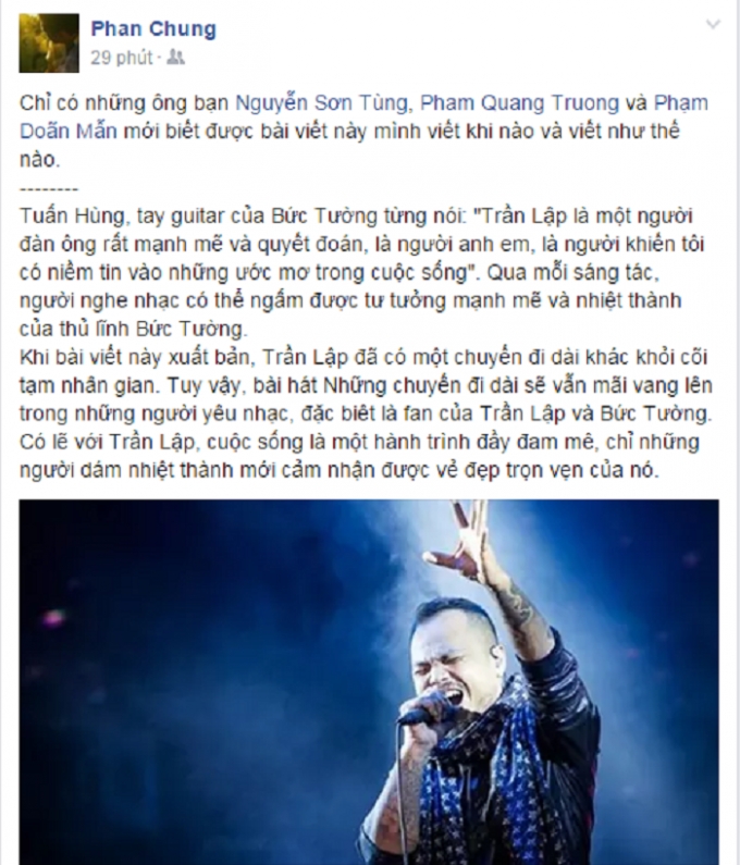 | Facebooker Xuân Tiến Nguyễn viết trên trang cá nhân: "Mắt Đen ơi, làm sao em hiểu Tâm hồn của đá?! Mấy ngày trước ai đó ngồi Một Mình nghe gió ngẩn ngơ ngoài hiên, giờ lại lặng lẽ sau Bức Tường nghe tâm sự của Người đàn bà hóa đá trăn trở con Đường đến ngày vinh quang...TRẦN LẬP vĩnh biệt anh!". |