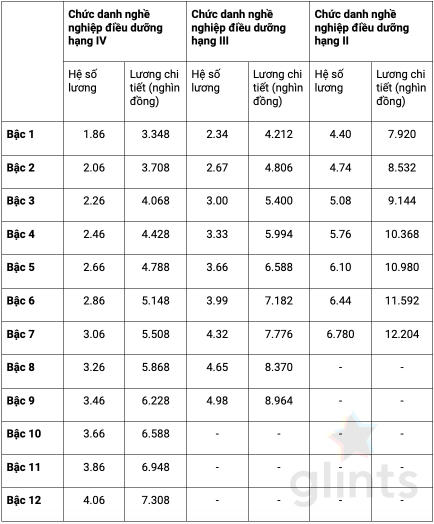 Kể từ 01/07/2023, lương cơ sở của cán bộ, công chức, viên chức chính thức được tăng từ 1.49 triệu đồng/tháng lên 1.8 triệu đồng/tháng. Như vậy, mức lương của các cán bộ công tác trong ngạch điều dưỡng cũng tăng lên.