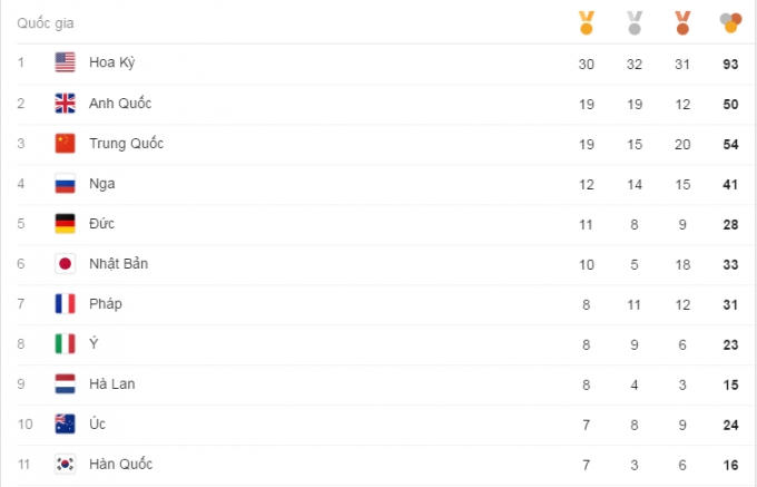Bảng tổng sắp huy chương Olympic 2016 ngày 18/8: Đoàn Thể thao Mỹ gia tăng khoảng cách với Top 2