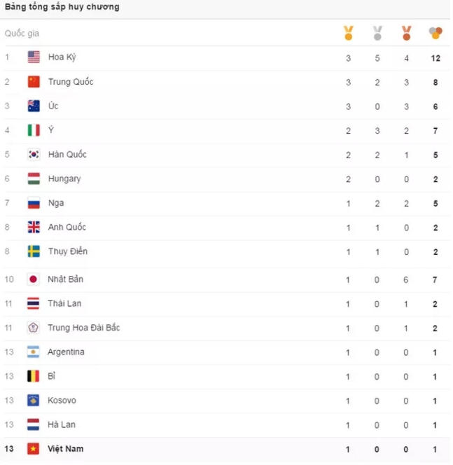 Tính đến thời điểm hiện tại (13h00 ngày 8/8 giờ Việt Nam), Đoàn Thể thao Việt Nam đứng ở vị trí thứ 13 trên bảng tổng sắp huy chương Olympic Rio 2016.