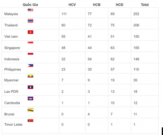 Đứng đầu vẫn là đoàn thể thao Malaysia với 111 Huy chương vàng/252 huy chương; Đứng thứ 2 là đoàn Thái Lan với 60 Huy chương vàng/206 huy chương; Đứng thứ 3 là đoàn thể thao Việt Nam với 55 Huy chương vàng/150 huy chương.