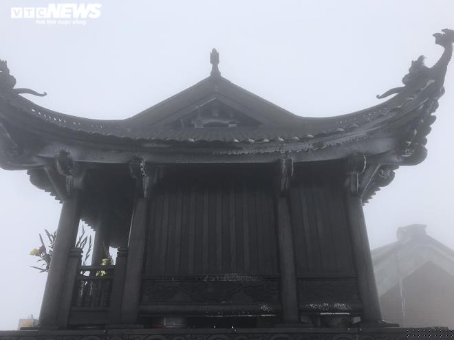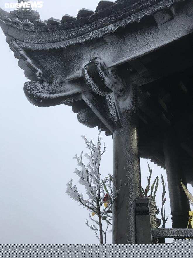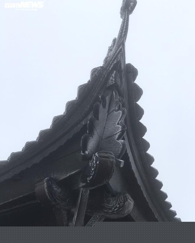 Mái chùa bắt đầu có tuyết trắng bám xung quanh...