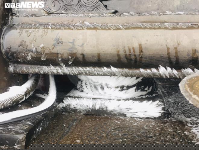 Dưới đế chùa cũng xuất hiện tuyết trắng bám vào các trụ cột như một bông hoa tuyết đang nở.