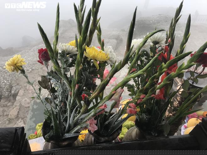 Những lọ hoa đặt trước ban thờ Phật cũng bị tuyết trắng bao phủ.