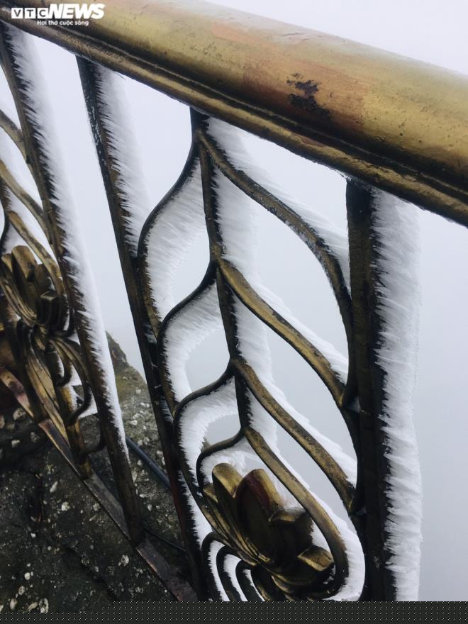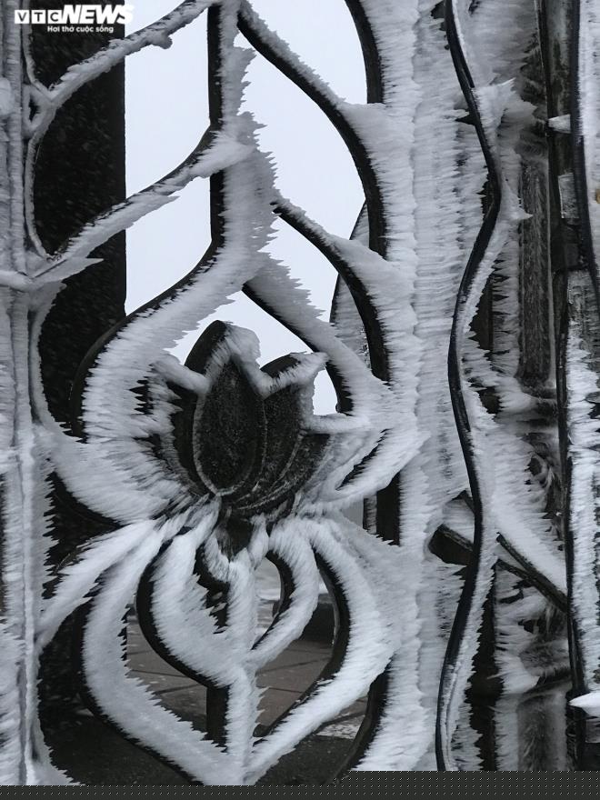 Lớp nước mưa hoặc sương ở nhiệt độ âm được tạo thành các màng tuyết tinh khiết bám lên thành các nan hoa lan can.