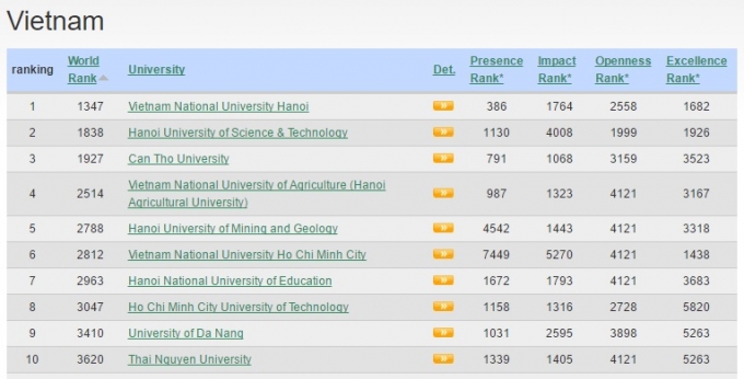 | Top 10 trường Đại học của Việt Nam do Webometrics xếp hạng |