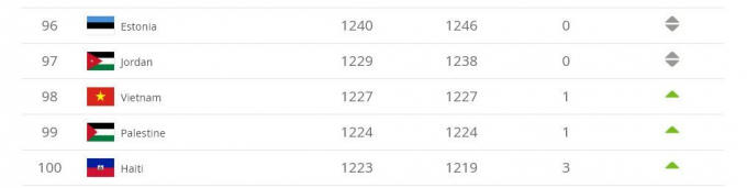 Tại châu Á, đội tuyển Việt Nam vẫn giữ vị trí số 16 phía sau Jordan và xếp trên ĐT Palestine. Khoảng cách giữa Việt Nam và Palestine là rất sát sao với 3 điểm mong manh.