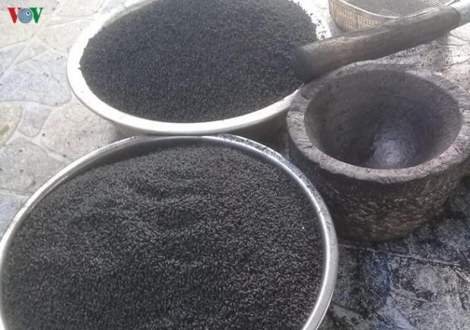 Gạo giã tro rơm làm bánh chưng đen chay.