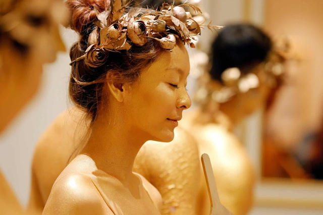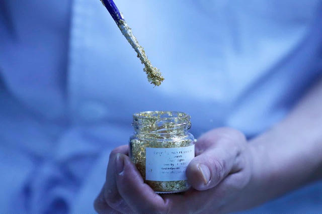 Đầu bếp phủ vảy vàng lên món ăn. (Ảnh: Luong Thai Linh / EPA)