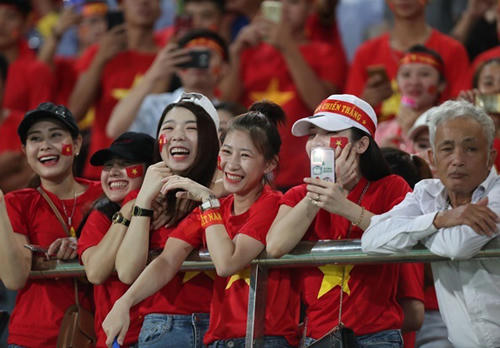 Rừng cờ đỏ, sao vàng và không khí rực lửa trên khán đài khiến không ít người lầm tưởng trận đấu này được tổ chức tại sân Mỹ Đình.