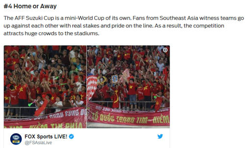 "AFF Suzuki Cup là giải World Cup thu nhỏ của mỗi quốc gia tham dự. Giải đấu đã thu hút được lượng CĐV lớn tới các SVĐ. Ở trận mở màn AFF Cup, lượng CĐV lớn của Việt Nam đã tới SVĐQG Lào. Họ thậm chí còn áp đảo hơn cả nước chủ nhà", Fox Sport nhấn mạnh.