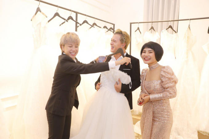 Cặp đôi Quang Anh, Bảo Hân cũng khá thích thú với những mẫu váy cưới mới lạ ở đây. Cả 2 cùng nhau đi ngắm từng mẫu váy một và luôn dành cho nhau những cử chỉ hài hước, dí dỏm, đáng yêu. Thậm chí, Bảo Hân còn giúp Quang Anh ướm thử váy cưới và trêu chọc Quang Anh là “cô dâu” của mình. Mặc dù đã ra khỏi phim nhưng cô nàng “tomboyloichoi” Ánh Dương vẫn không ngừng “bắt nạt”, “đè đầu cưỡi cổ” anh chàng Bảo Bảo.