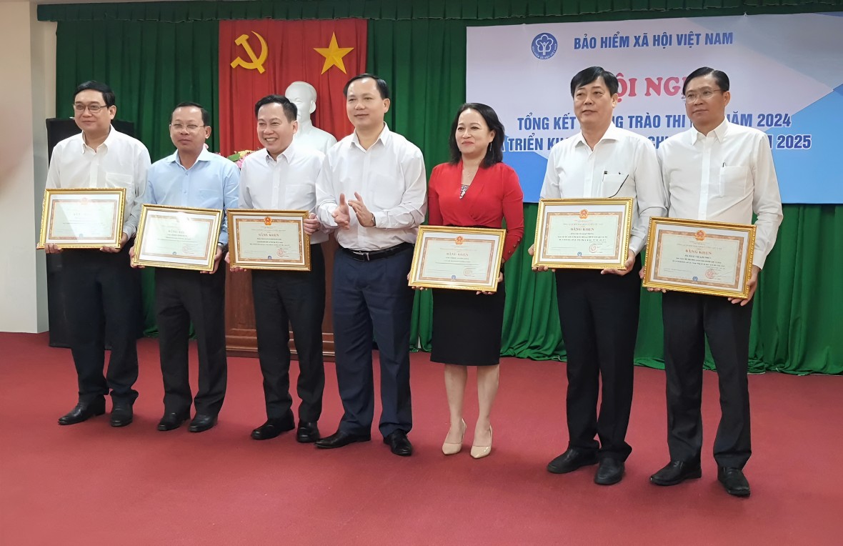 | Tổng Giám đốc BHXH Việt Nam tặng Bằng Khen cho ông Trịnh Trung Kiên - Giám đốc BHXH tỉnh Cà Mau (thứ 2 từ trái sang), có thành tích xuất sắc trong phong trào thi đua năm 2024. |